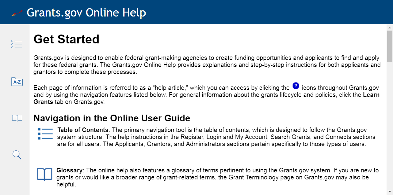 Glossary: The online help also features a glossary of terms pertinent to using the Grants.gov system. If you are new to grants or would like a broader range of grant-related terms, the Grant Terminology page on Grants.gov may also be helpful.