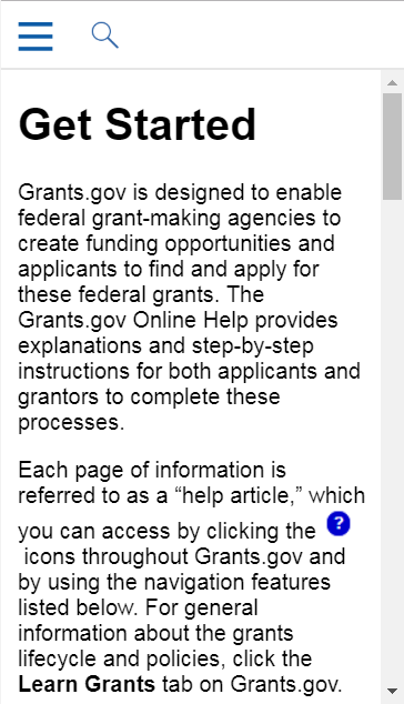 The Grants.gov Online Help is built with a responsive design to allow for multiple views based on your device and screen size. On computers and devices with smaller screen sizes, the expanded table of contents will not display automatically.
